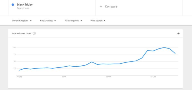 As you can see over the past 5 years, the search interest piques each year around October and November, just before Black Friday, and seems set to continue.