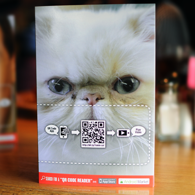 Applebees, an American restaurant chain, uses QR codes to promote their fast lunchtime service. In June 2011, they began printing QR codes on tabletop advertisements. Each picture (a cat or a man) had a QR code pasted over its mouth. This encouraged customers to take out their smartphones, scan the code and enjoy the wait.