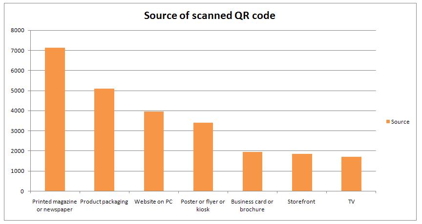 Here are a few additional useful facts from the same ComScore survey. Of the 14,452 people who took part in the survey (each of whom may have selected more than 1 answer) most people (7,138) said that they’d scanned QR codes found in printed magazines or newspapers. The fewest scanned QR codes that appeared on television.