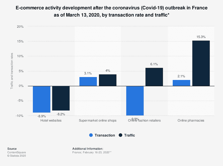 Ecommerce has become a critical business asset during this pandemic, with much of the public working from home or self-isolating with little to do. Some online businesses are reaping the benefits of having a fully-fledged ecommerce store up and running, while other retailers have had to quickly adapt in order to take online/phone orders and deliver these to customers. The graph below shows how the coronavirus pandemic and subsequent lockdown has impacted our neighbours in France.