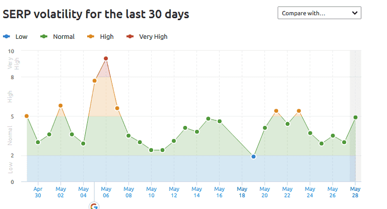 You can see that the SERP volatility was deemed very high by the SEMrush tool which tracks and measures search results.