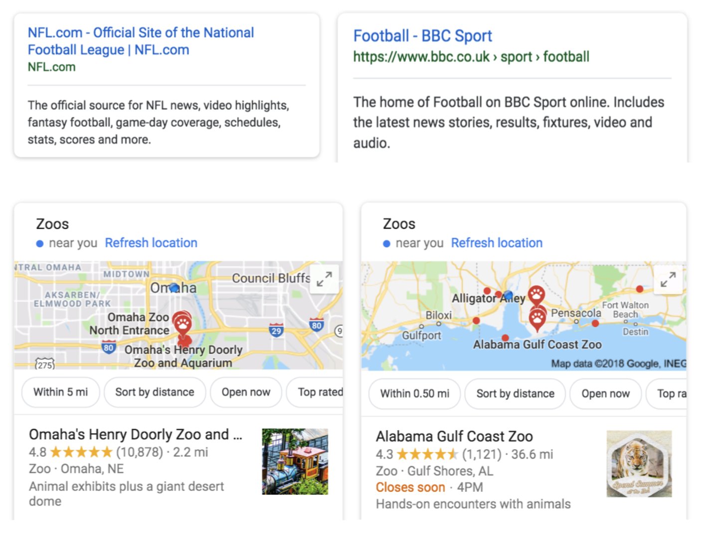 Localization is extremely useful in making results more relevant. For example, people in the US searching for “football” do not generally want UK football results, and vice versa. People searching for “zoos” in one area often want locally-relevant listings…