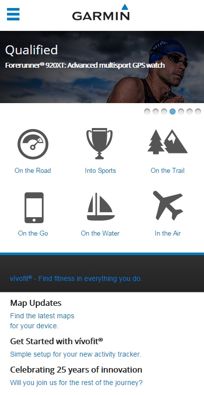 Garmin’s responsive website looks very nice on a mobile, with clear icons which are catered to customer needs. The Burger icon also brings up a very useful and informative menu on the left-hand side.