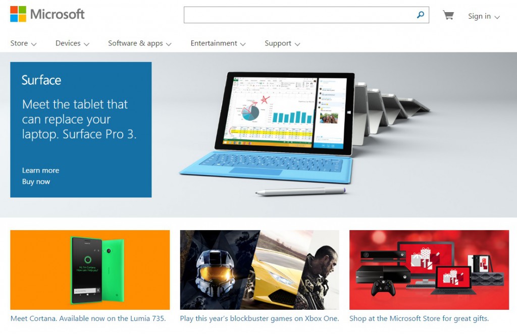 Microsoft make use of bright colours, whether it’s for their Surface or Lumia range, with each product standing out very clearly. On mobile, each division within Microsoft has their logo displayed, from Windows to Skype, for quick direction to the appropriate part of the site.