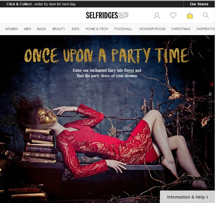 Selfridges is all about image, and that is exactly what you’re presented with upon opening the website. Scrolling produces more images one after another, showing a range of products, and ending in a number of links for inspiration.