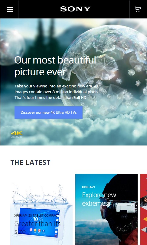 The UK Sony site is fully responsive, and looks great on a mobile phone. Featuring a header image which directs to their flagship product, their 4K Ultra HD televisions, with scrolling down revealing more products with latest news and hottest products.
