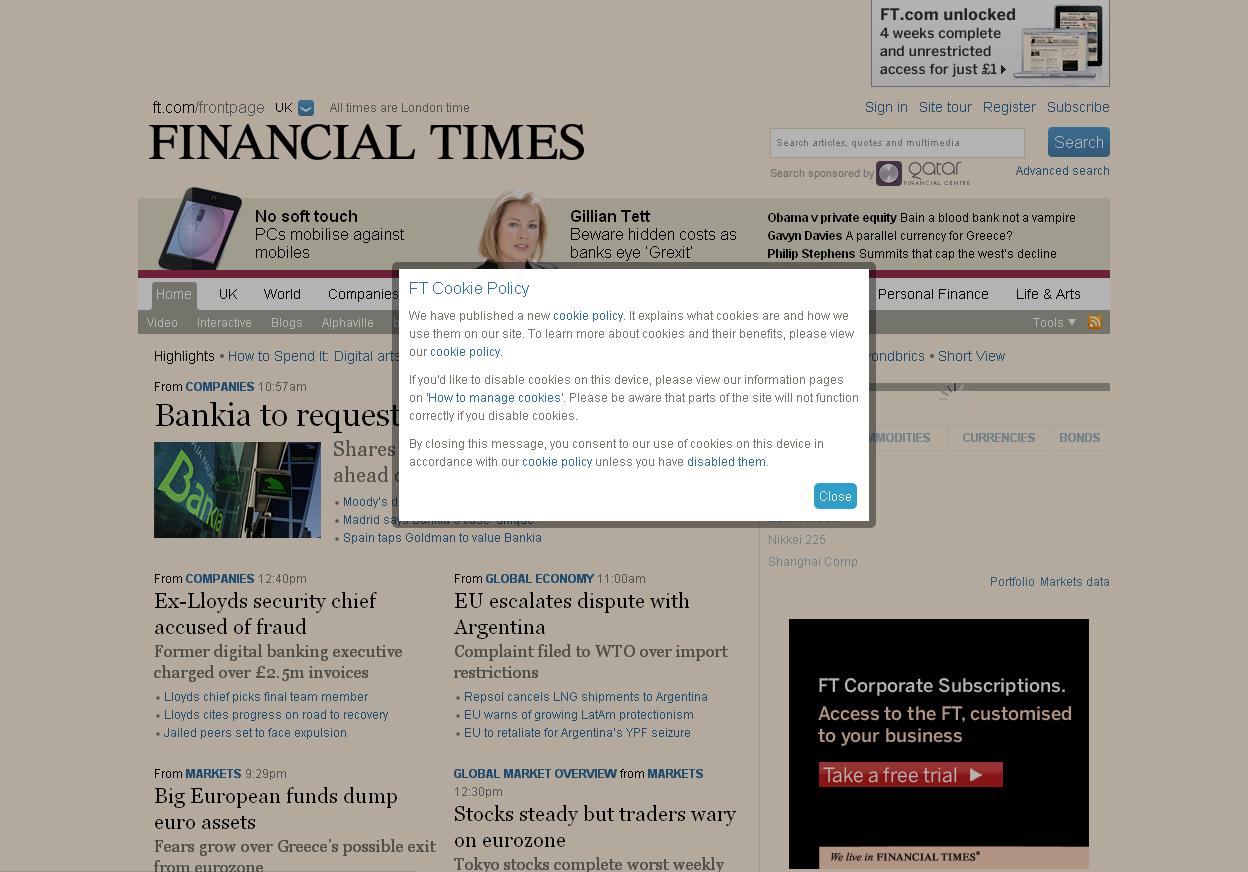 The Financial Times website has probably placed the boldest statement of all. Of course, they can afford to. SMB’s that took an approach like this might see a big dip in site visitors. Before you can read any of their online content, you have to agree to close the FT Cookie Policy box which displays. By closing the box you agree to accept cookies. If you do not agree, you can disable cookies or change your settings by clicking on specific links within the box.